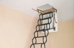 - Крышка люка фиксируется надежным креплением, что исключает возможность её самостоятельного открытия. При этом механизм раскладки лестницы настолько прост, что им смогут воспользоваться даже дети.